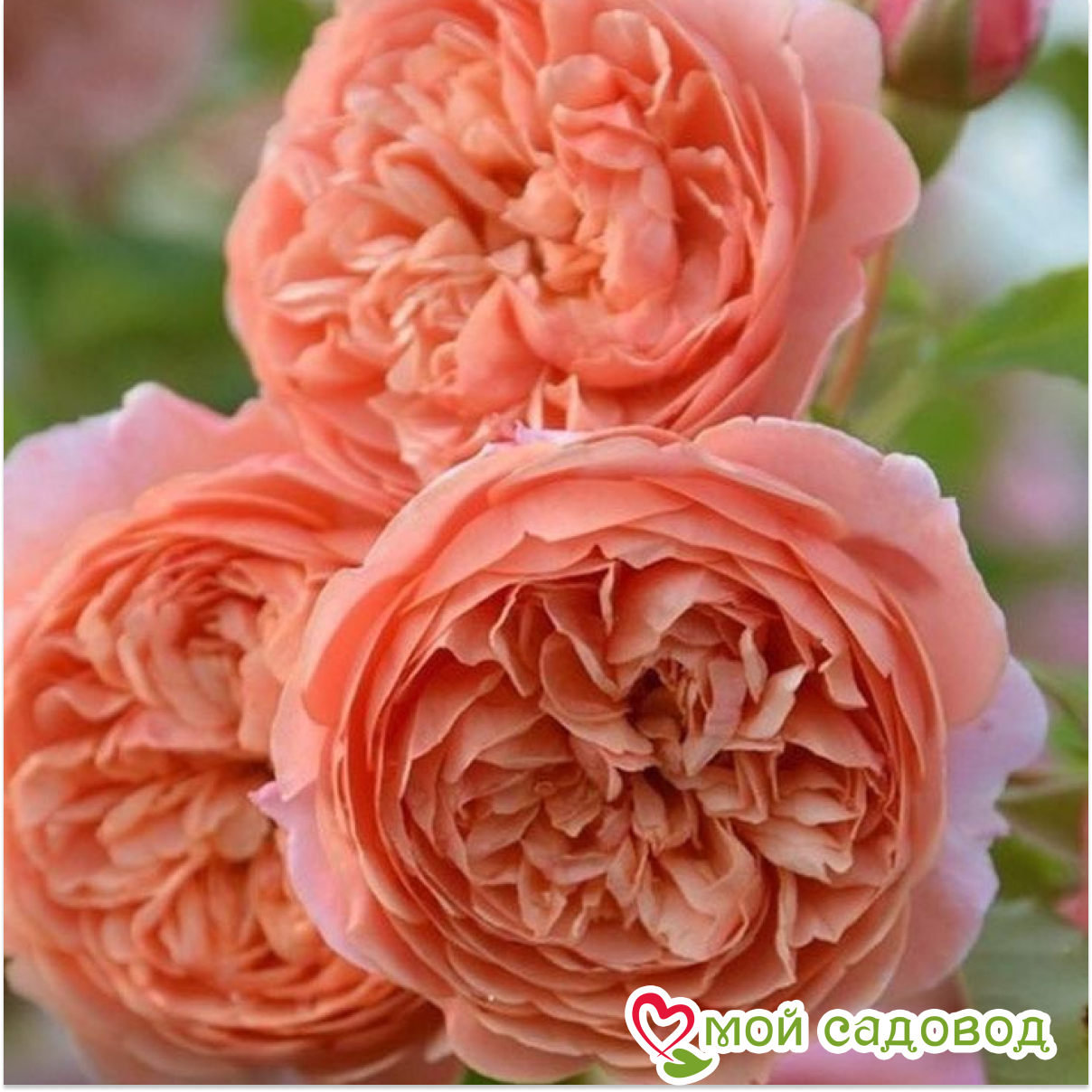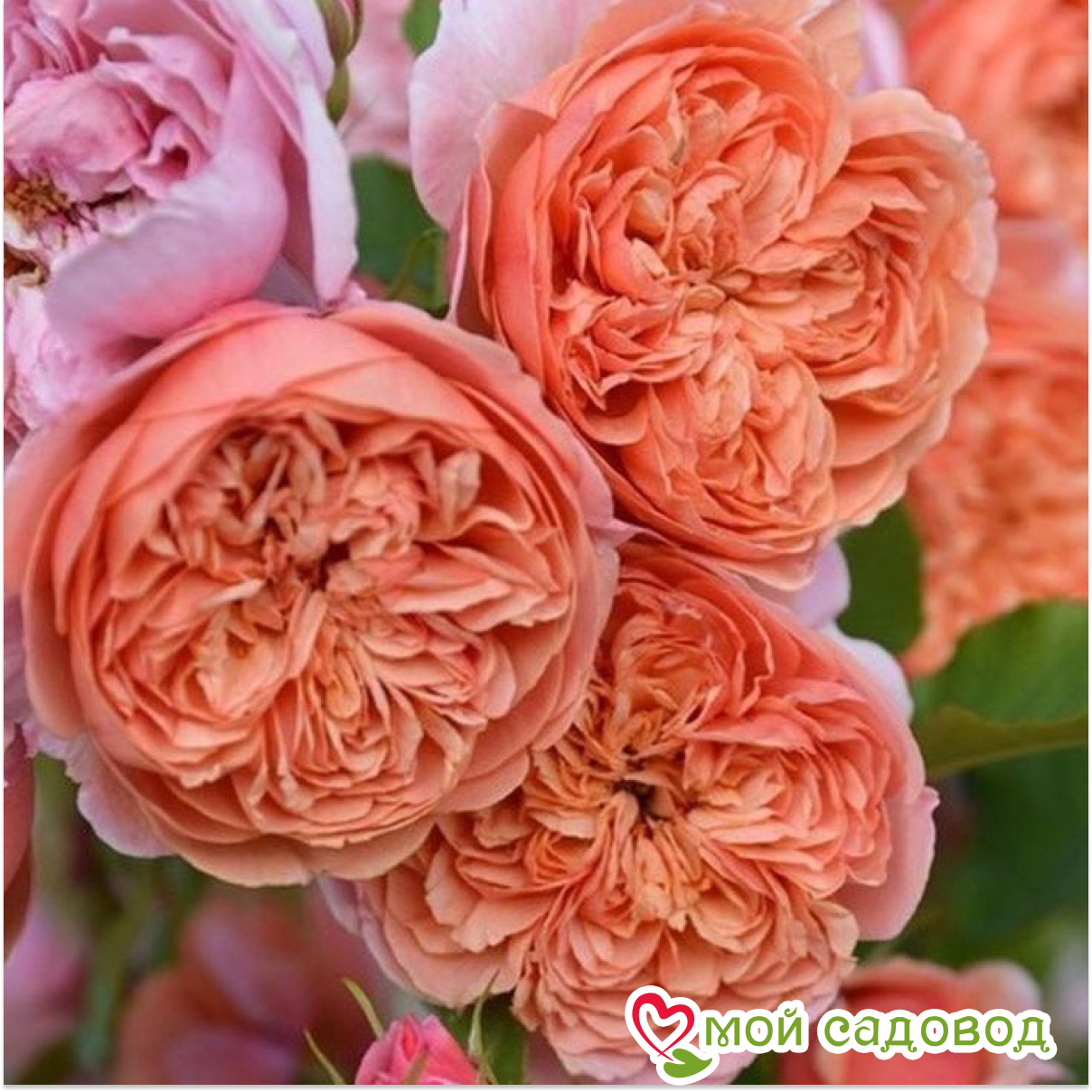 Бутон темно-оранжевый, заостренный. Цветок от ярко-золотисто-персикового до темно-абрикосового с более светлыми внешними лепестками, чашевидный до квадратного, густомахровый (60-80  лепестков), диаметр 8-10 см, обладает очень насыщенным ароматом с нотками персика и манго, медленно раскрывается, долго сохраняет форму. Цветение очень обильное, продолжительное до заморозков, повторное. Растение крепкое, сильнорослое с высокими прямостоячими побегами. Лист темно-зеленый, средний, глянцевый, кожистый, удлиненный. Устойчивость к заболеваниям: высокая. Как хранить растения, если вы получили посылку раньше начала посадочного сезона: Если роза спит — храним в холодильнике или подвале при температуре от 0 до +4 °С, или на улице в коробке под толстым слоем снега. Если роза проснулась — прикопать в теплице или высадить в сад, обеспечив укрытие. Можно посадить розу в горшок и хранить в прохладном подвале или на балконе/лоджии, притеняя от прямых солнечных лучей. Во время хранения периодически проверяйте состояние посадочного материала. Поврежденные, загнившие части корней удалите и обработайте фунгицидом (Топаз, Фитоспорин).